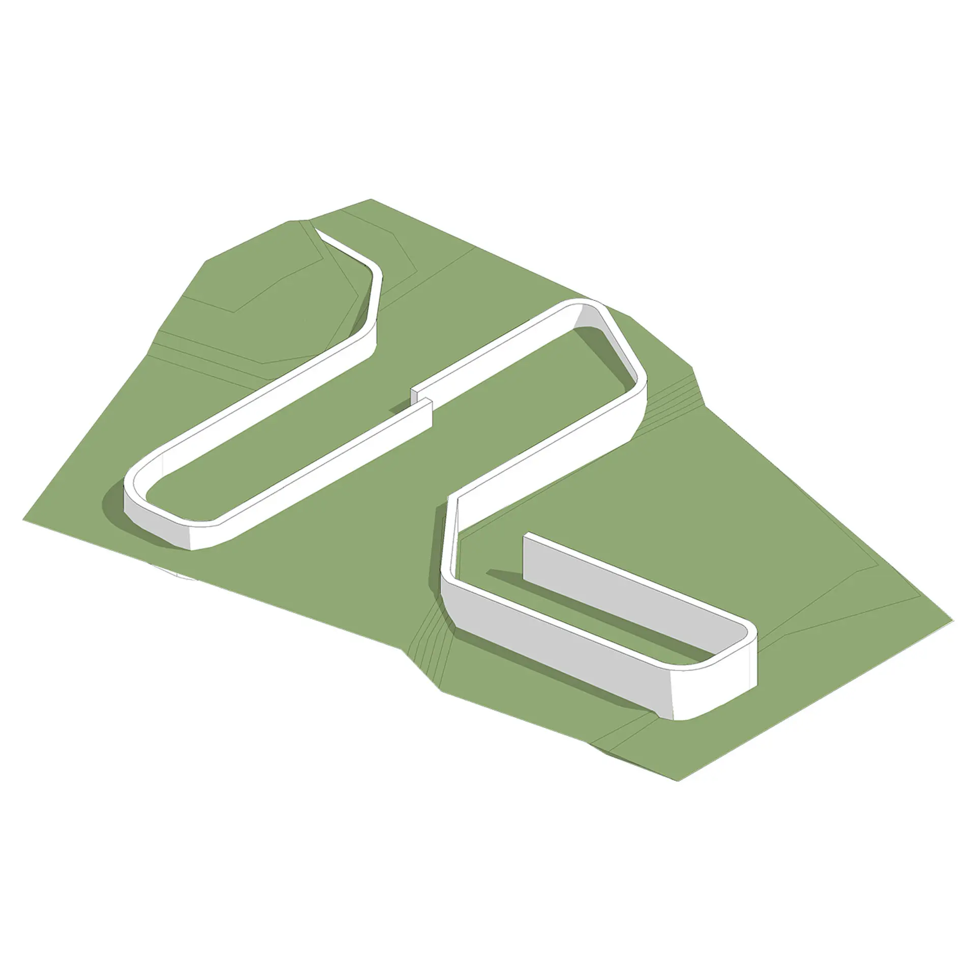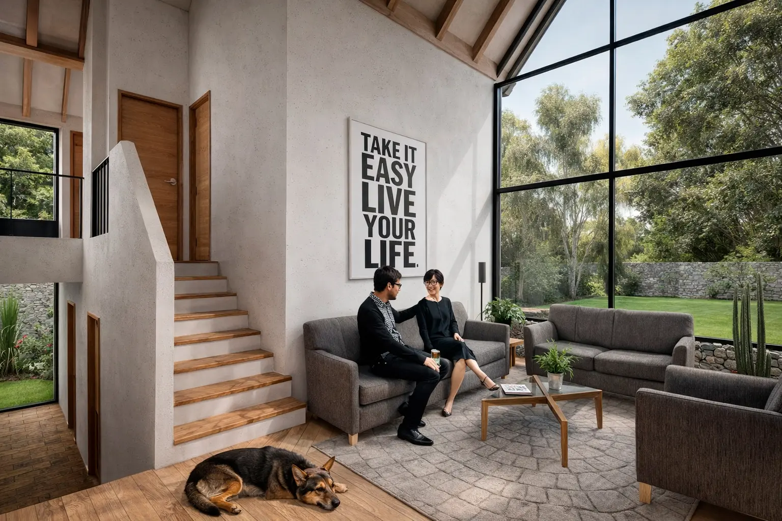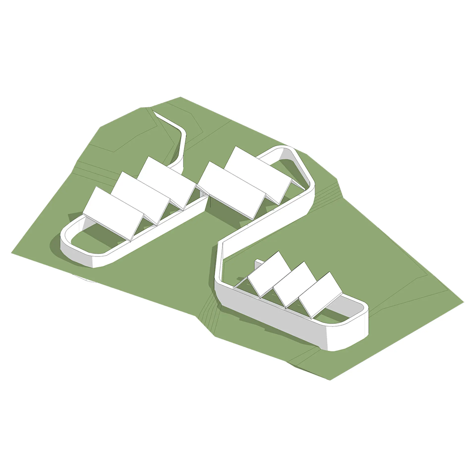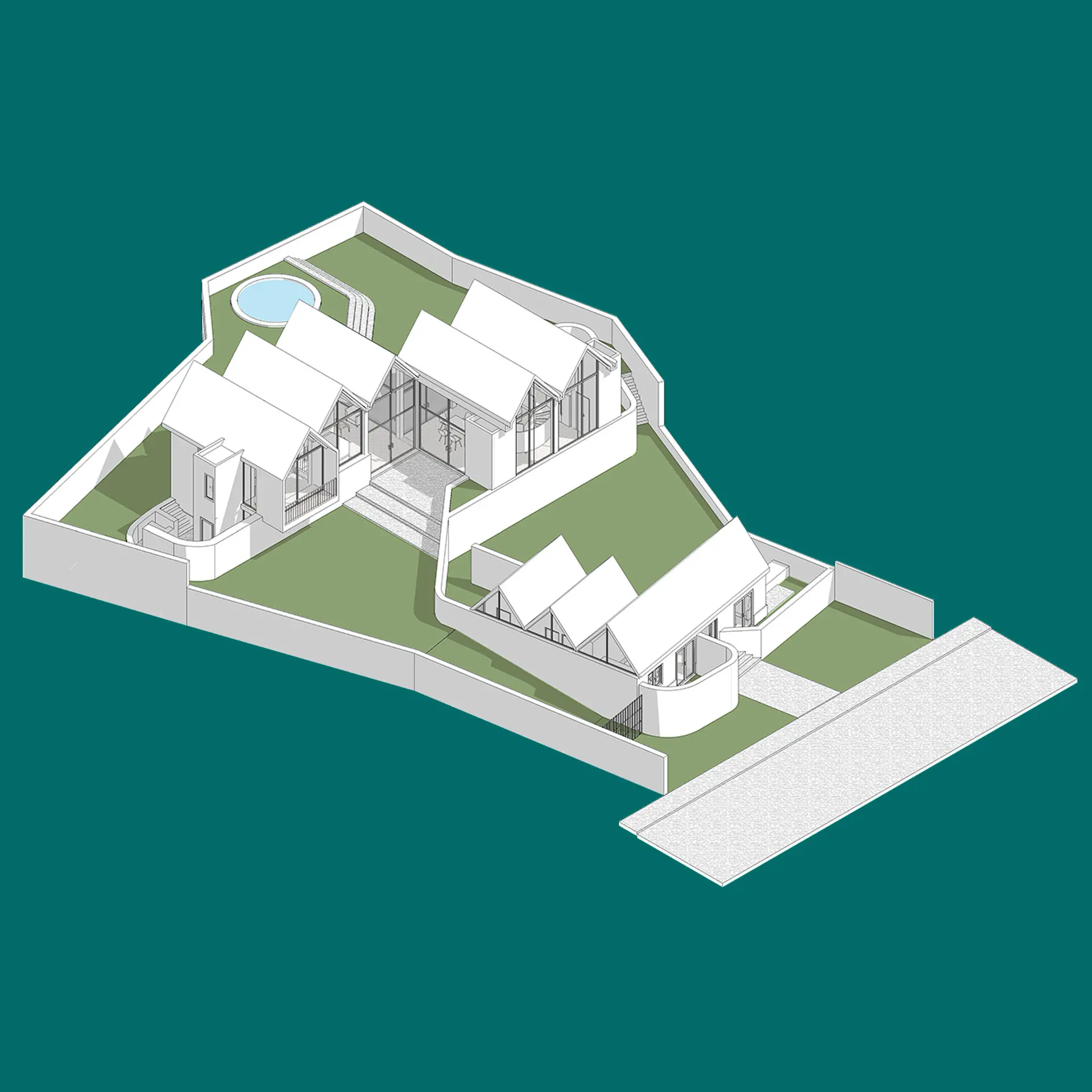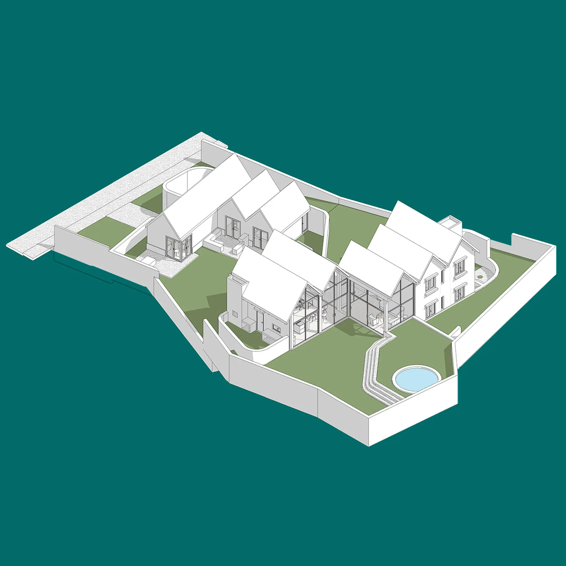 La parcela, en una zona residencial de baja densidad, tiene dos plataformas topográficas diferenciadas que permitieron dividir las áreas privadas de las públicas. Un gran muro de piedra, elemento común en la arquitectura local, unifica el conjunto y sirve de base para los techos inclinados, integrando el proyecto con el entorno rural donde se emplaza.