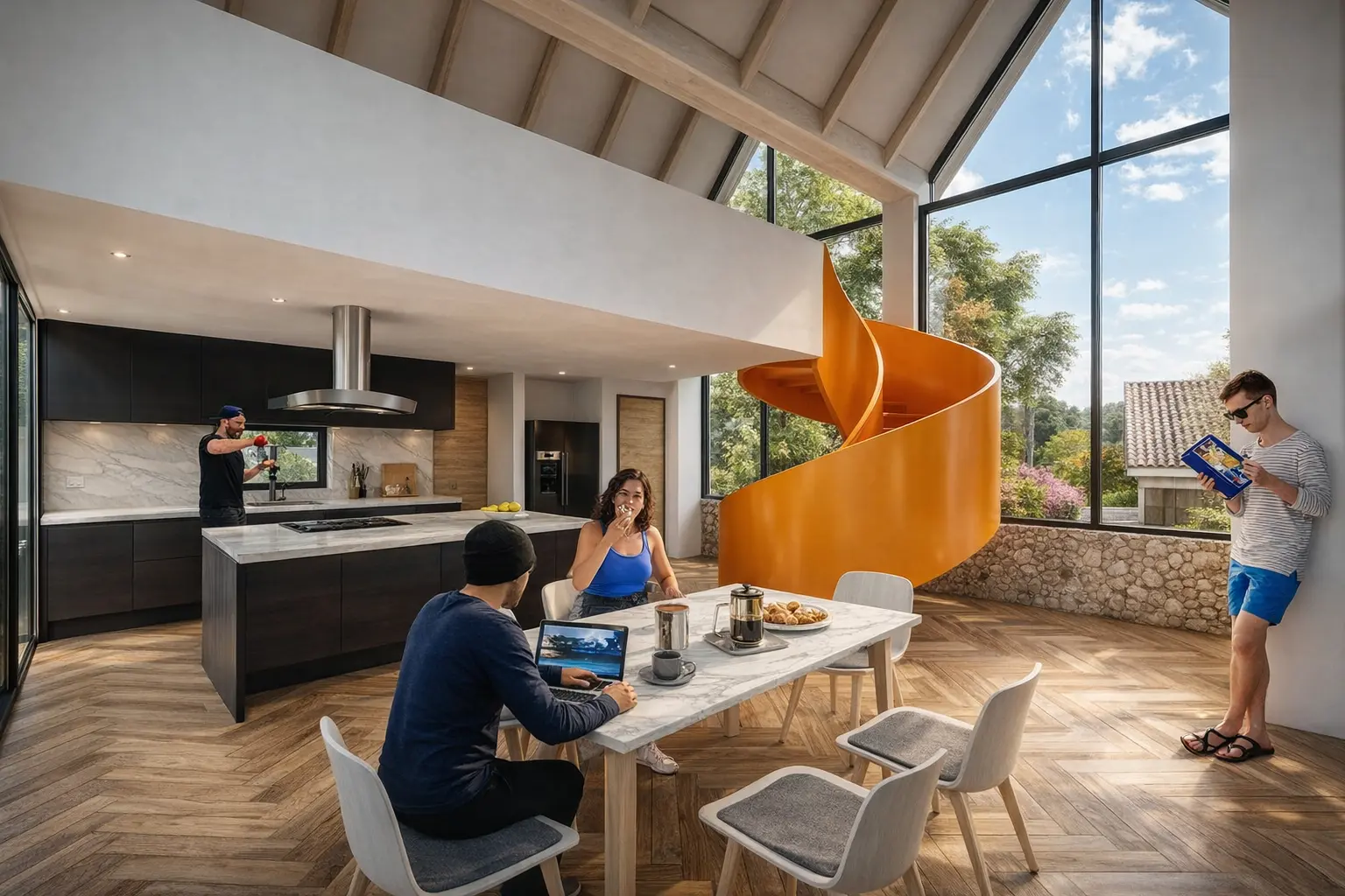 En la plataforma baja está la vivienda para Airbnb, con espacios comunes y áreas abiertas para actividades al aire libre. La plataforma alta alberga la vivienda del propietario, con dormitorios, zonas sociales, un estudio y una piscina, todo rodeado de áreas verdes.