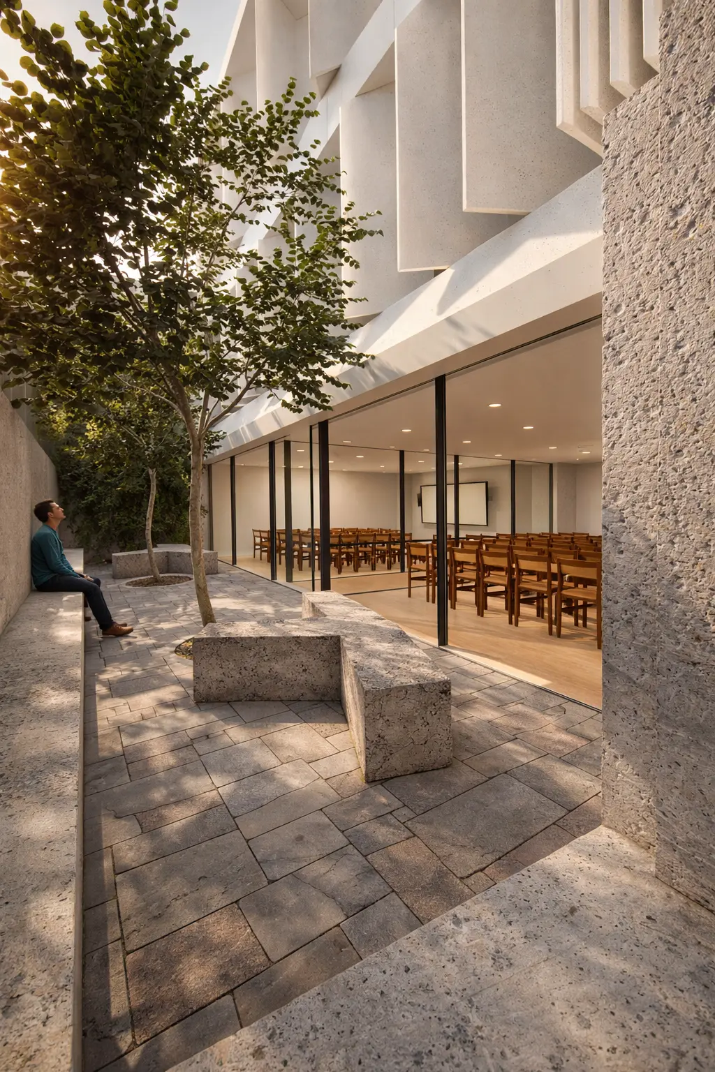 Al tener como material base al sillar blanco, se decidió dar un recubrimiento blanco a la edificación nueva de concreto armado, armonizando así ambos volúmenes, pero diferenciándolos claramente en tonos y texturas, lo que conlleva a una armonía de lo antiguo y lo nuevo.
