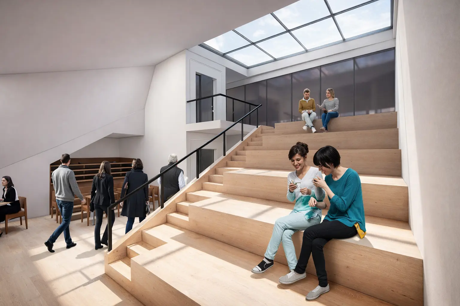 La edificación contempla tres patios, cada uno con características distintas, permitiendo ser usados como espacios de exhibición, lectura, área de expansión para los salones multiuso, café al aire libre y terraza. Por otro lado, estos permiten una correcta iluminación y ventilación natural de los espacios interiores del proyecto. Cabe resaltar, que se ha intervenido la casona generando mezanines para aprovechar la doble altura existente. Así también, se han generado nuevos vanos para iluminar los espacios ubicados en este nuevo segundo nivel.